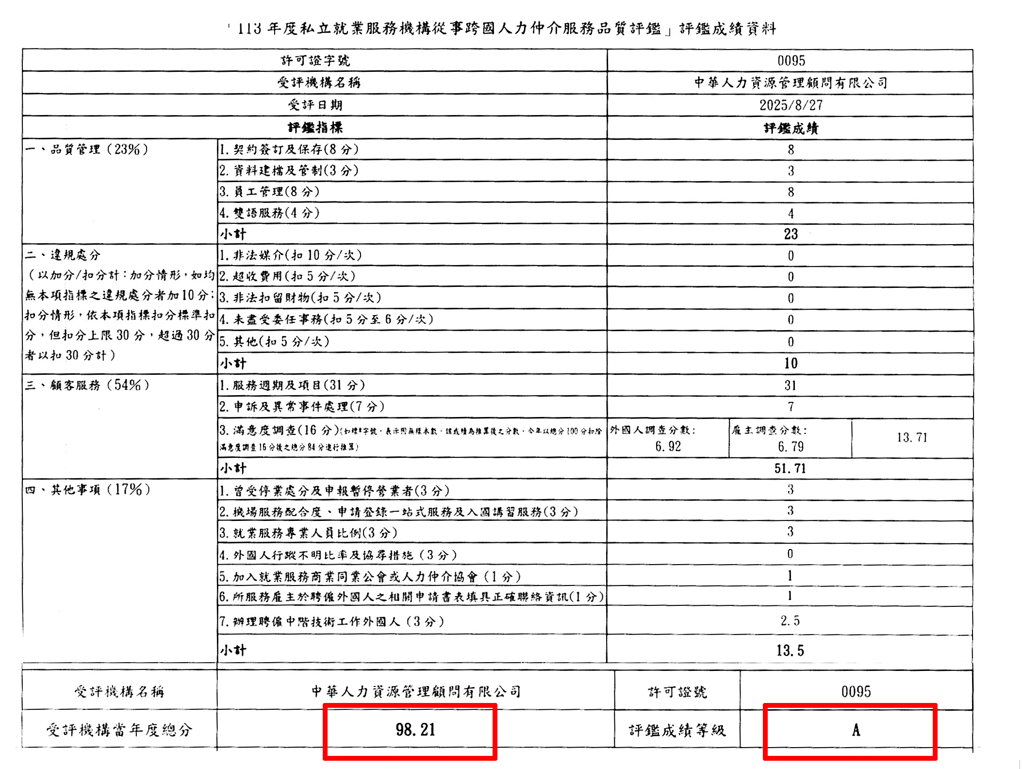 我們做到了!🎉賀!中華人力資源管理顧問有限公司在勞動部「113年度私立就業服務機構跨國人力仲介服務品質評鑑」中,榮獲總分 98.21 分、A 級 的優異成績。從品質管理、顧客服務到各項加分指標,我們都獲評審一致肯定。這份成績,是每一位夥伴對專業與誠信的堅持,更是每一位客戶與雇主的信任所堆疊而成。謝謝一路支持的客戶與夥伴,你們的信任,是我們每天把服務做到更好的理由。未來,我們會用更細緻的陪伴,回應每一次跨國用工的期待。