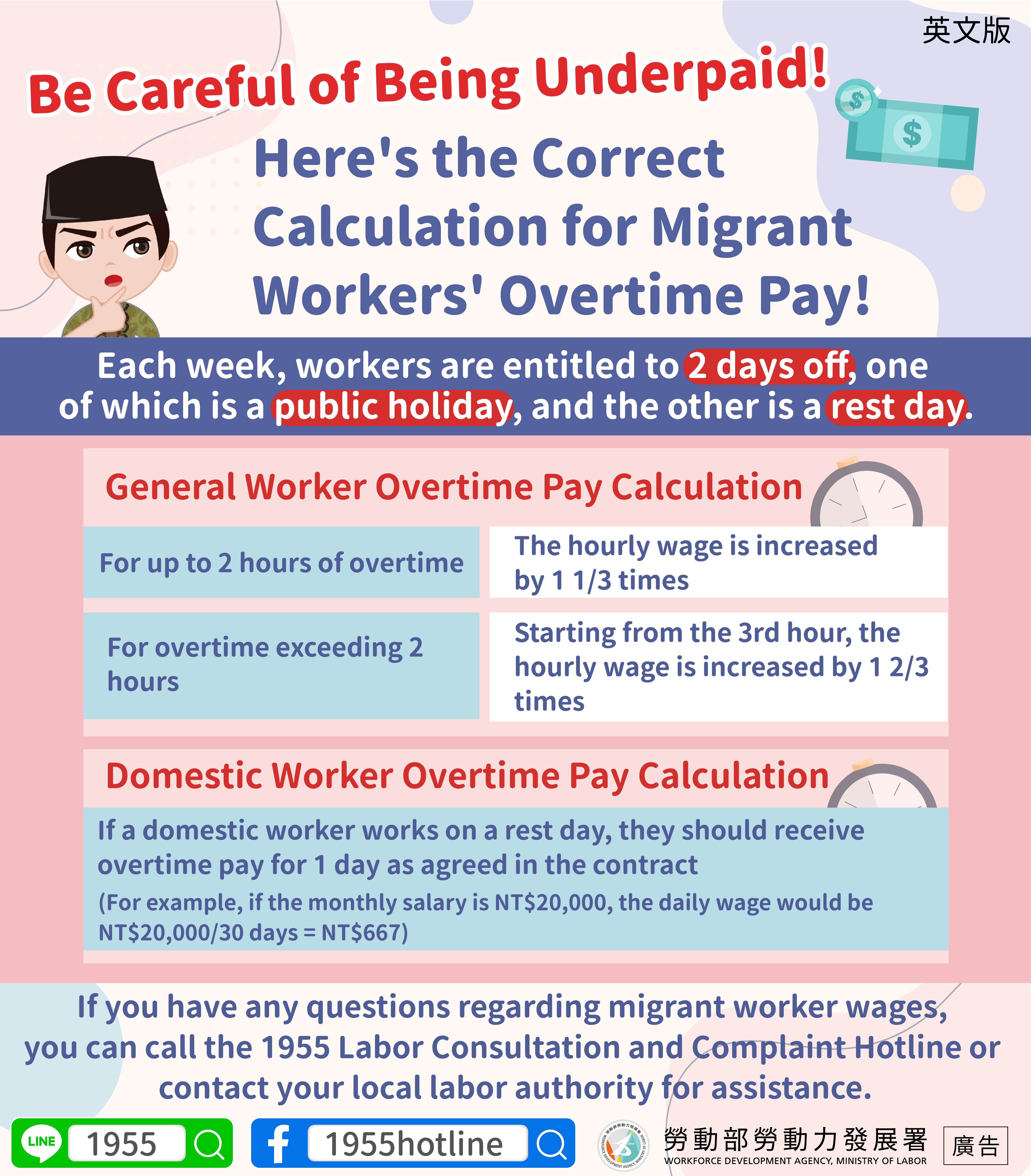 •If a domestic worker works on a rest day, they should receive overtime pay for 1 day as agreed in the contract(For example, if the monthly salary is NT$20,000, the daily wage would be NT$20,000/30 days = NT$667)